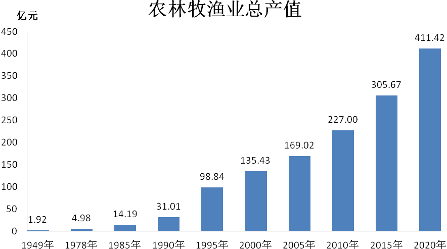 从农林牧渔业总产值看。1996年、2008年、2014年和2020年全市农林牧渔业总产值分别突破100亿元、200亿元、300亿元和400亿元关口。2020年,全市完成农林牧渔业总产值411.42亿元,现价产值是1949年的214.28倍,扣除价格因素年均增长4.3%。