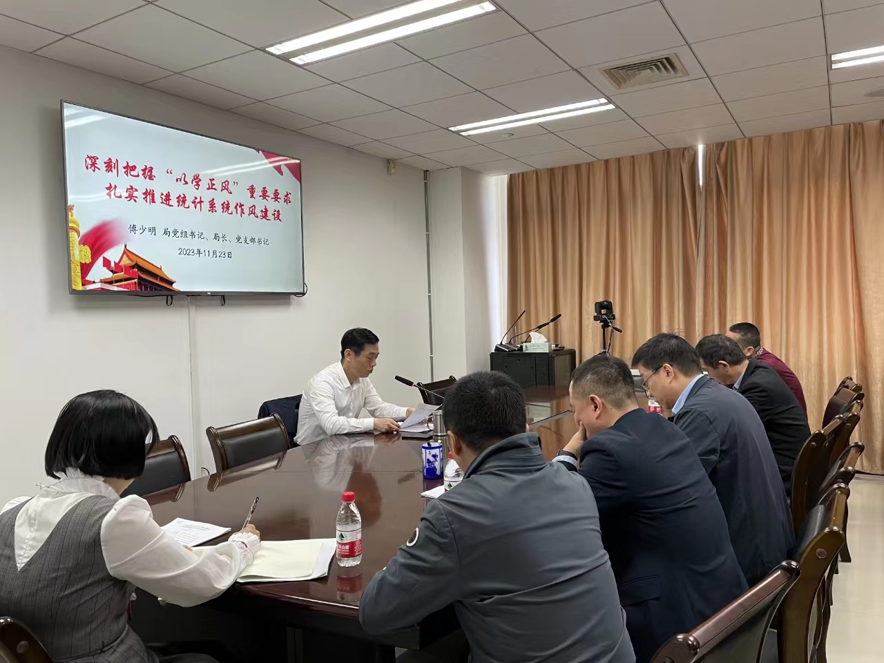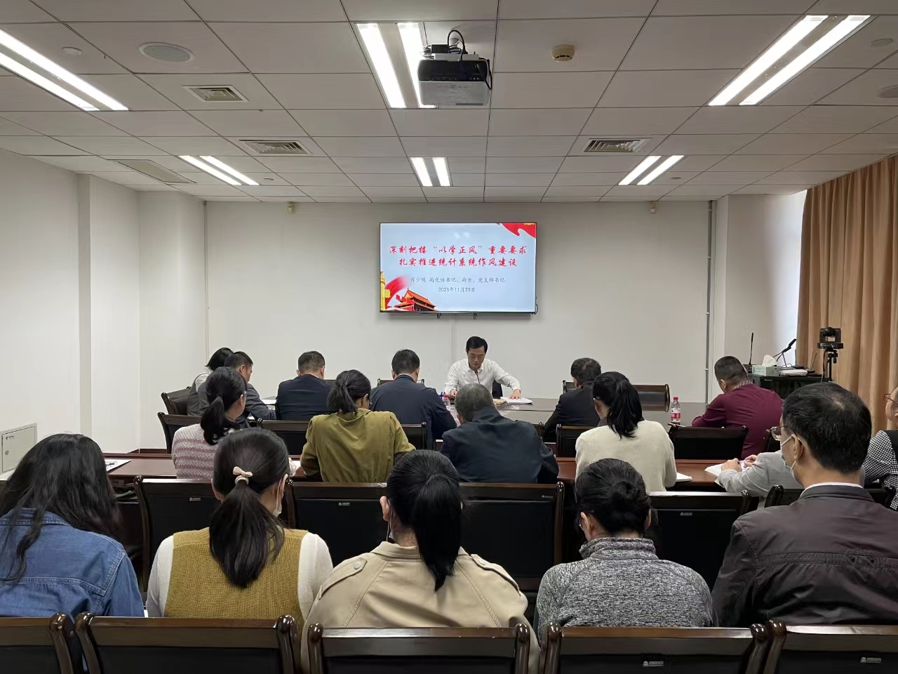 11月24日,根据市委统一部署,市统计局党组书记、局长、党支部书记傅少明以“深刻把握‘以学正风’重要要求 扎实推进统计系统作风建设”为题,为局机关全体党员、干部和退休党员代表讲授主题教育专题党课。